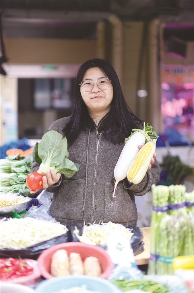 26岁的梅洁,在刀茅巷农贸市场卖蔬菜。