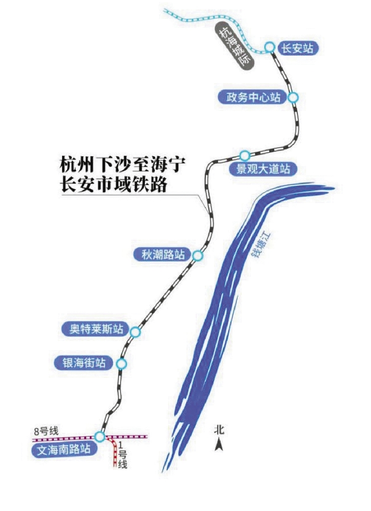 杭州下沙至海宁长安市域铁路示意图。