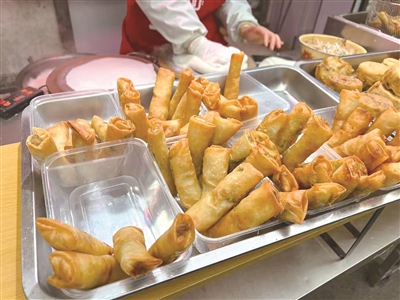 一盒盒包好的春卷摆好,喜欢哪种口味可以直接拎走,价格都是15元一盒(10个);想要自己动手包的,光买春卷皮,15元一斤。现在很多摊位还推出了现炸春卷的服务,炸好的春卷20元一份(10个),想要现吃的话,也可以买半份,5个10元。