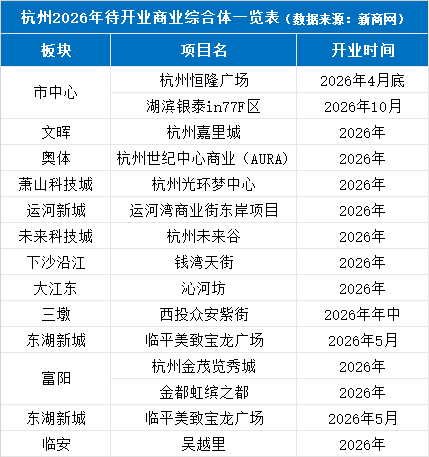 2026年,杭州将迎来一波商业综合体开业潮。包含备受瞩目的杭州恒隆广场、杭州嘉里城、杭州光环梦中心、杭州世纪中心商场AURA、湖滨银泰in77F区等。