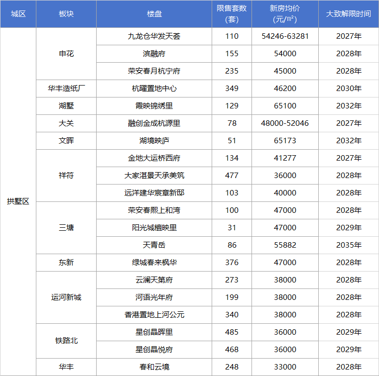 进入2026年,又一波曾经的红盘将陆续迎来解禁,比如三墩北板块的紫璋台、天澜、彩虹轩,三盘合计约2164套;湘北的博语华庭作为萧山区首个热点楼盘,在去年12月已有173套房源解禁,今年上半年预计还将迎来约600套解限房源;余杭区勾庄板块的前宸在去年底已解限约400套,今年解限套数将超700套。
