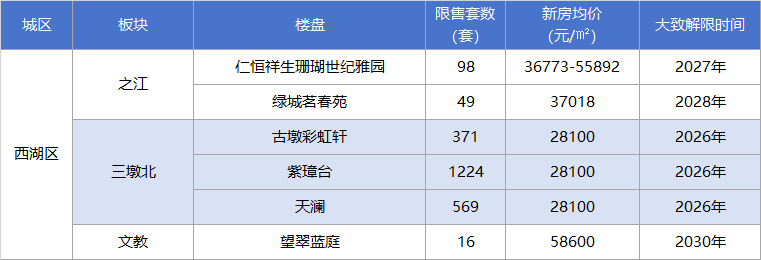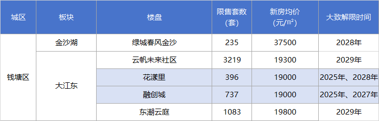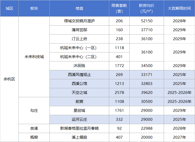 据潮新闻美好生活研究院统计梳理,杭州实施新房限售的5年左右时间里约诞生了3.45万套限售房源,涉及全杭州30余个板块、80多个楼盘。去年9月开始,杭州第一批五年限售楼盘3000多套房源解禁入市,包括未来科技城的西溪公馆、地铁万科天空之城、勾庄板块的万科前宸、运河云庄、大江东的融创城、花漾里等昔日热点红盘。
