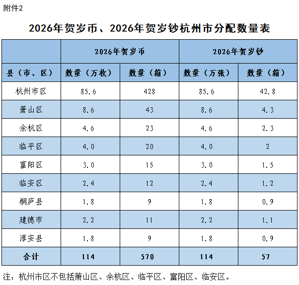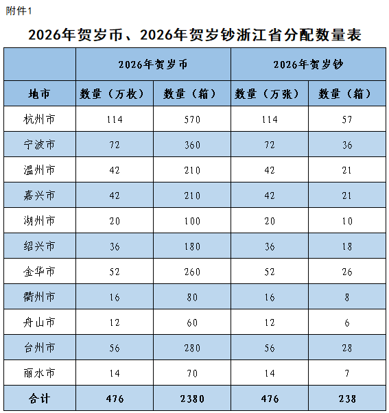 根据中国人民银行统一部署,2026年贺岁币面额为10元,贺岁钞面额为20元。浙江省2026年贺岁币、2026年贺岁钞发行数量分别为476万枚、476万张,其中杭州市分别为114万枚、114万张。