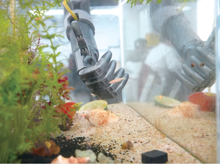 黑漫科技位于文一西路旁的浙江海外高层次人才创新园,一进门就能看到一个鱼缸。几条小鱼在缸里游来游去,旁边还有一只不断“活动”的灵巧手,像在打招呼。