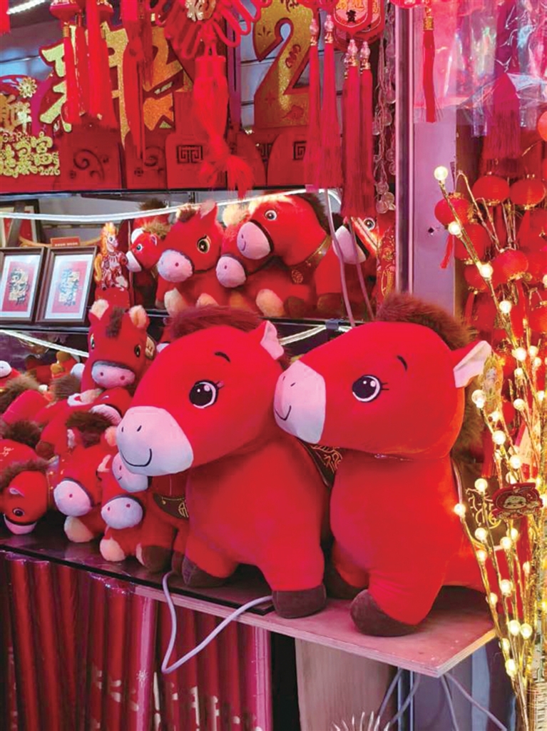 记者注意到,今年各家年货店的“C位”基本上被前段时间爆火的“哭哭马”“笑笑马”和各种含有马元素的公仔占领。从经典的中国红到亮眼的紫、蓝配色,从小巧玲珑的钥匙扣到半人高的大号公仔,造型也是五花八门:有的顶着马毛发髻憨态可掬,有的印着“马到功成”“马上有钱”的讨喜文字,还有手工编织的布艺小马,精致又可爱。