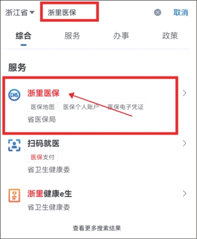 ①在“浙里办”App首页搜索框内输入“浙里医保”,点击“搜索”按钮。