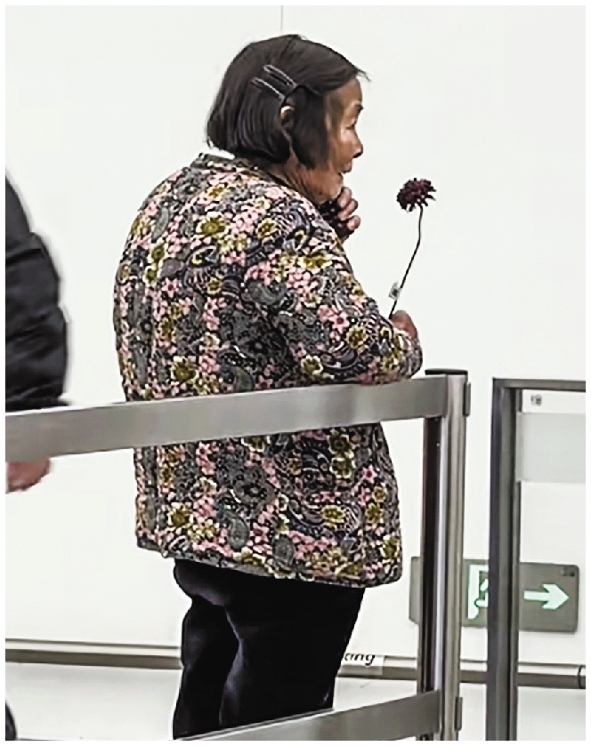 当姜先生推着行李车出现,姜奶奶立刻迎上去,把花塞到儿子手里。记者问,又有儿子接,又有妈妈接,是不是特别高兴?这位60多岁的男人显得有些羞涩,点点头,朴实地笑着说:“很高兴,很高兴。”