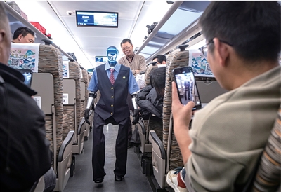 列车员拿着“保持安静”的提示牌在静音车厢内巡视提醒。