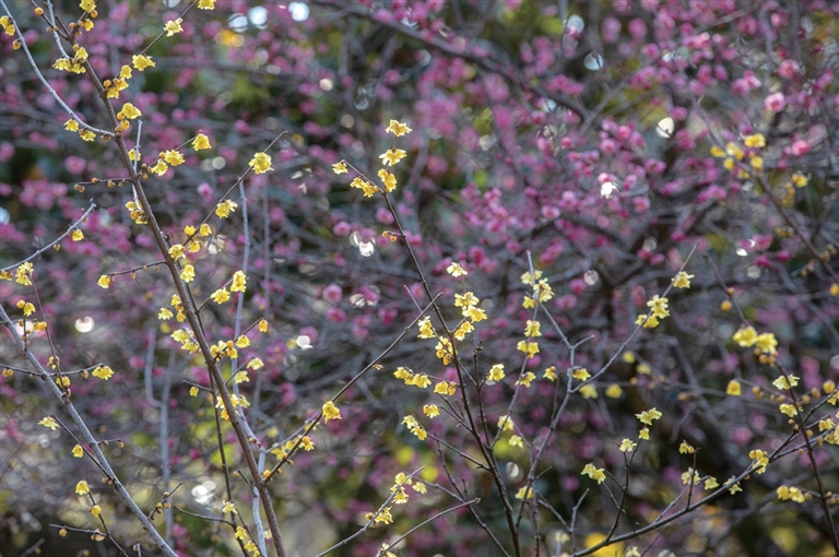 杭州植物园蜡梅、红梅“二梅争艳”。 记者 陈中秋 摄