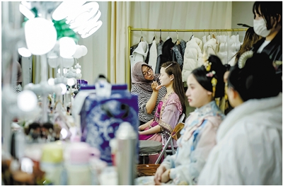 最近,央视开年大戏《太平年》的热播,让吴越国的造型成为妆造旅拍的新热门。“就在前段时间,已经做过两组吴越国男子造型了,他们选择的拍摄地点是宋城。”付蒙娜说,紧跟热播剧和网络热点,随时学习新的妆面和服饰搭配,已经成为店内员工的日常功课。