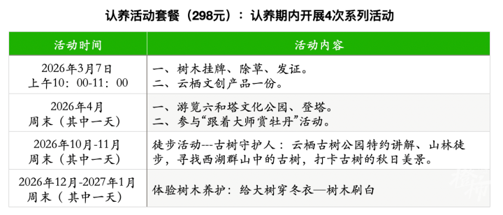杭州西湖风景名胜区钱江管理处在白塔公园一年一度的树木认养活动也正式开启。本次认养活动时间为3月7日(周六),每株树木领养费用298元(含材料费、全年养护费、认养期间四场活动费用、云栖竹径文创产品一份),认养期一年,授予认养证书。