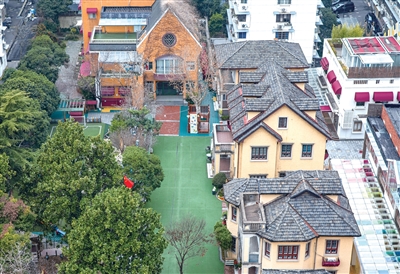 从灯芯巷北口进来,没走多远,就能看到杭州市人民政府机关幼儿园——东西两个园区隔着小巷面对面,西园院子里的建筑有些特别,红砖甬道旁边是四幢造型各异的欧式别墅。