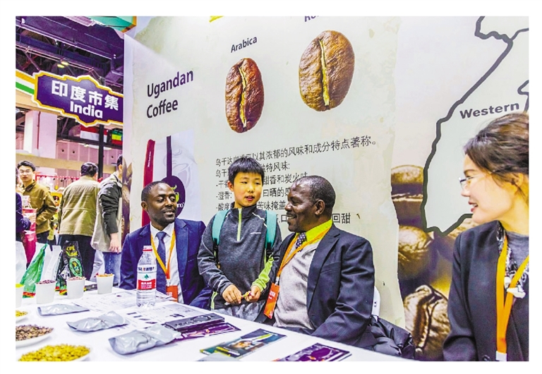来自乌干达的展商向围拢过来的中国消费者热情介绍本国的咖啡豆。