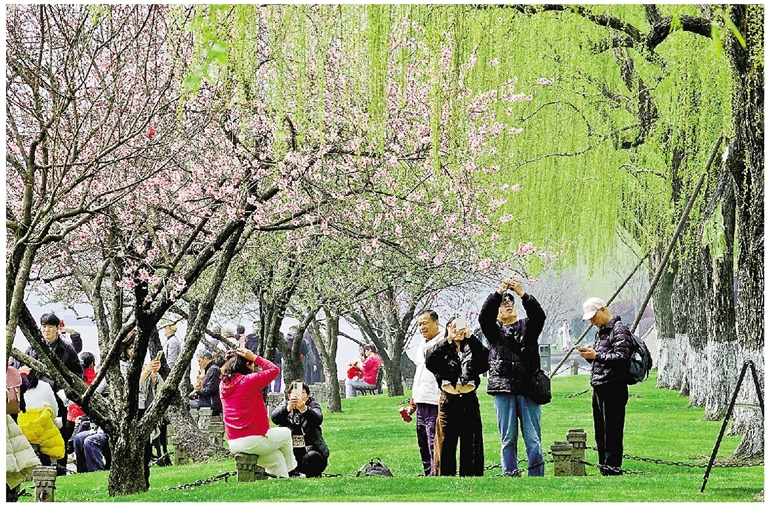 3月19日,西湖白堤上“间株杨柳间株桃”的春日经典画卷,吸引中外游客纷纷驻足打卡。
