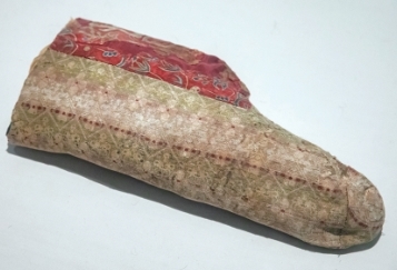 这一时期的展品中还有一对经过修复的精美锦袜,整体呈筒状,脚面部分由多块锦料拼缝而成,脚跟部分则采用红色绢制成,其上用米白、绿等色丝线以锁绣技法绣出蔓草。