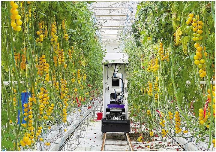 机器人本体装备了视觉感知系统、机械臂和定制化的末端执行器,其工作流程融合了感知、决策与执行3个步骤。这位“新农人”通过多模态视觉系统识别番茄的成熟度、大小和精确位置,即使在枝叶交错的复杂环境下也能准确定位。随后,决策系统规划出最优的采摘路径,机械臂带动仿人手设计的末端执行器接近果实,轻柔高效地完成采摘,以避免“二次损伤”。采摘下的番茄会被放入随车果筐,当筐满或电量不足时,机器人会自主规划路线,前往仓库卸货或充电站充电。