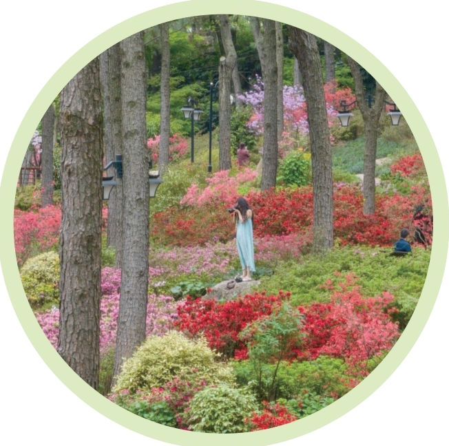 红装素裹、红双喜、幻境、紫孔雀、粉蝴蝶、火烈鸟、西塘小桃红、小青莲、羊踯躅、天章、御代之荣、瑶妃、紫晶、紫气东升、石岩杜鹃、刺毛杜鹃、安酷杜鹃……数十万株杜鹃相继绽放,层层叠叠,缀满山间,如云似霞。行走其间,随手一拍,便是春天的封面大片。