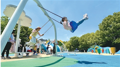 昨天,黄龙体育中心,孩子们在蓝天下荡秋千。 记者 陈中秋 摄