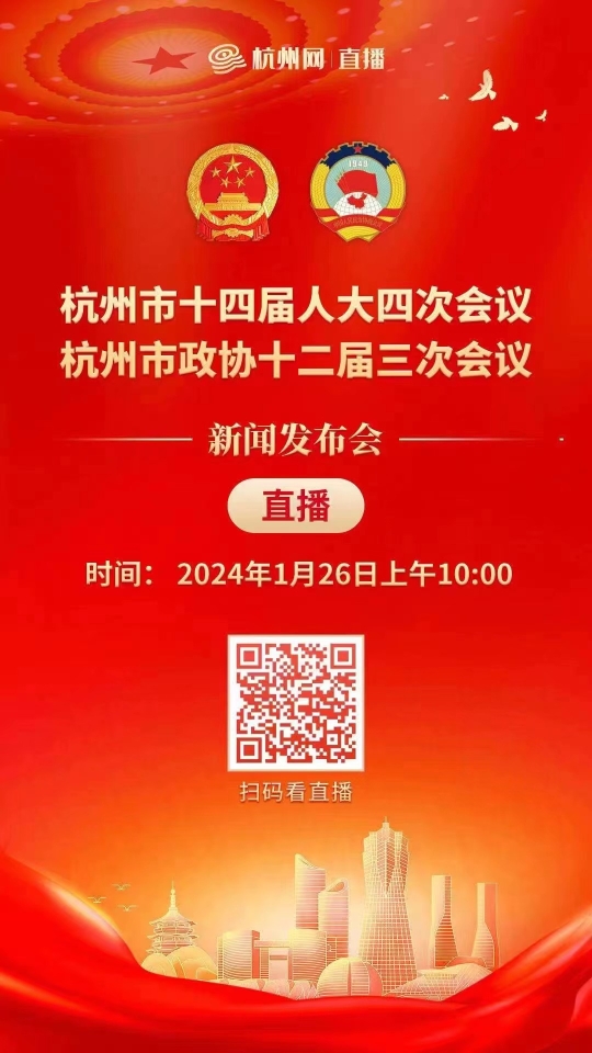 杭州市人民政府新闻办公室于2024年1月26日(周五)上午10:00举行杭州市十四届人大四次会议、杭州市政协十二届三次会议新闻发布会。市人大研究室、市政协研究室相关负责人将出席发布会介绍有关情况并答记者问。